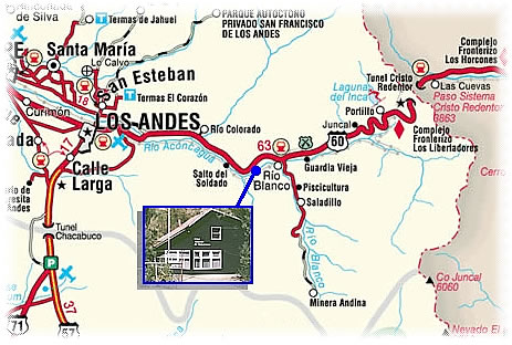 Los Andes (Rio Blanco) Ubicado en la orilla sur del camino internacional entre Los Andes y Portillo. Kilometro 28.