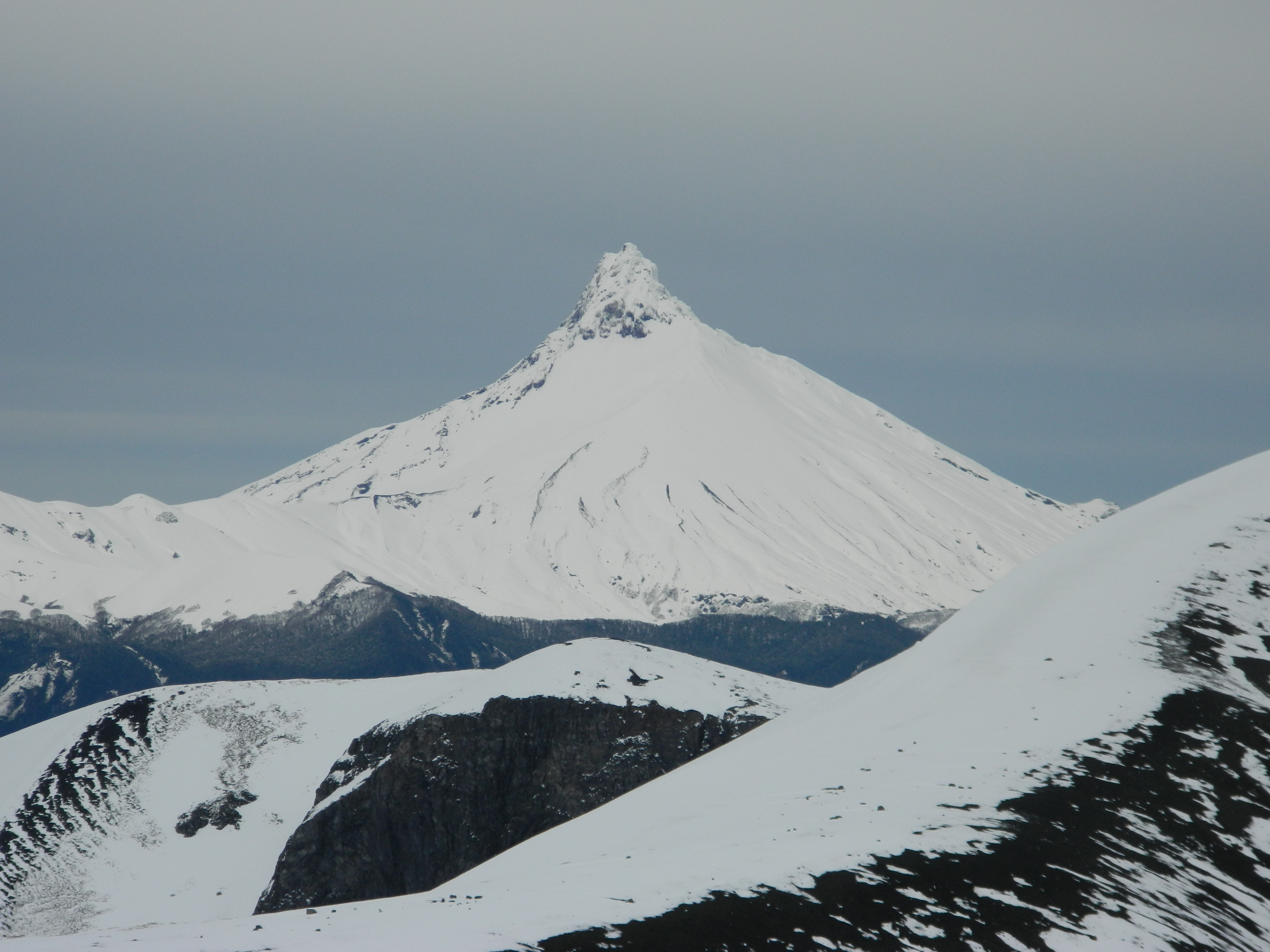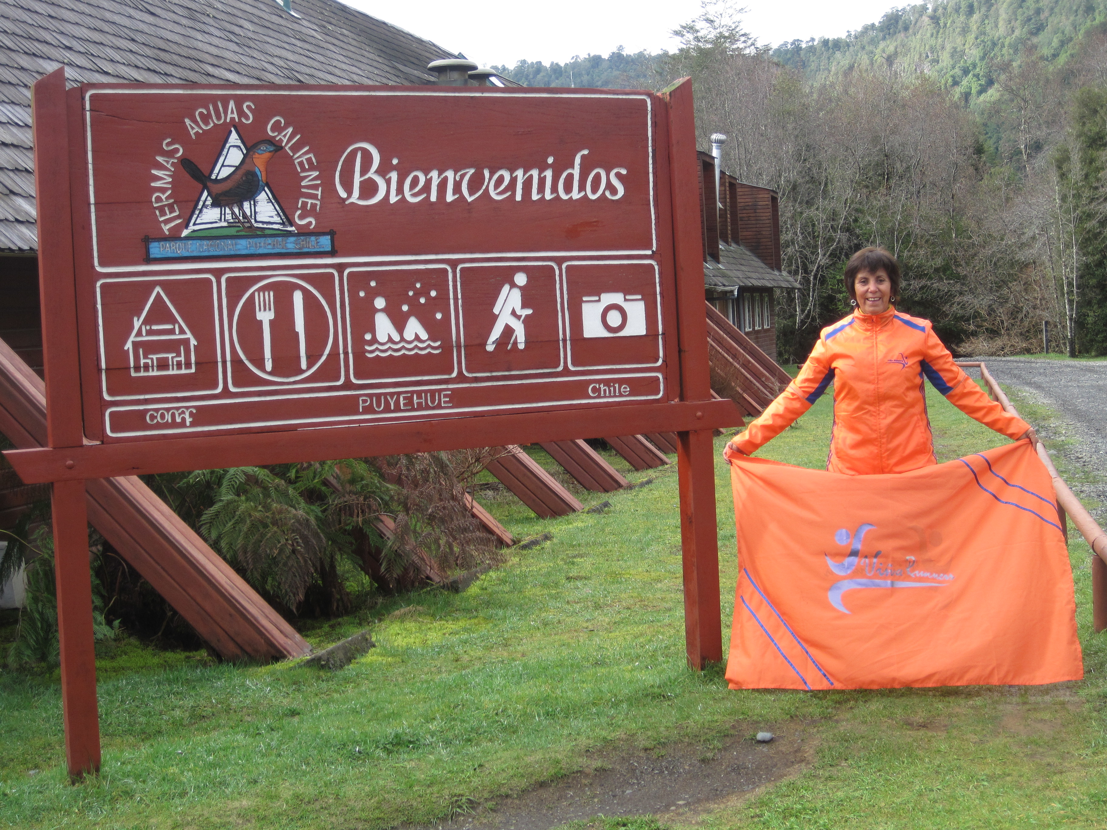 Salida del centro de Ski Antillanca a las 07:45 hrs, cruzamos el bosque nevado en dirección al Cráter Raihuen (Cráter parasito del centro eruptivo Antillanca). Una vez allí, pudimos divisar la ruta completa a la cumbre, apuramos el paso porque sabíamos que las buenas condiciones meteorológicas – excepto el fuerte viento - se mantendrían solo hasta pasado el mediodía. La condición de la nieve era acartonada muy dura en algunas partes y profunda en otras (hasta la rodilla). Alrededor de las once divisamos un andinista en la ladera norte que pretendía subir a la cumbre desistiendo posteriormente, seguramente a causa del viento, lo que nos dio mala espina pues el viento blanco reinaba desde el portezuelo norte hasta la cima. Una vez en el filo a la cumbre pudimos comprobar lo anterior, todo el trayecto a la cumbre presentaba grandes zonas de hielo escarchilla y un aumento de pendiente producto de la nieve acumulada por el viento. La ascensión se torno muy difícil y entendimos porque desistió la persona que habíamos visto anteriormente y que ahora se divisaba a lo lejos en dirección a Antillanca. Para llegar al borde del cráter, debimos tallar peldaños en el hielo para darnos seguridad debido a que el viento nos desequilibraba constantemente, en la arista cumbrera costaba mucho mantenerse firme y de pie, la visibilidad producto de la nieve que arrastraba el viento era prácticamente nula, pero pudimos ver a unos cinco metros una formación rocosa de unos cuatro metros de alto cubierta de hongos de hielo que indicaban la cumbre, imposible de subir por las condiciones que existían en ese instante. La nubosidad alta comenzó a bajar y tapaba ya las cumbres del Volcán Osorno y Puntiagudo, lo que no indicaba que en pocos minutos nosotros quedaríamos cubierto por las amenazantes nubes, más, lo difícil del terreno, nos recomendaba el sentido común que debíamos bajar rápidamente. Carmen, quería sacarse la foto con el banderín de “Viña Runners”, a lo cual le dije que se olvidara de fotos y que debíamos concentrarnos en nuestra seguridad y salir lo antes posible del lugar para no perder nuestra orientación porque empezaría a nevar. Insistió tanto, diciendo que la había traído desde tan lejos para no mostrarla, y que además se había comprometido con Victor de hacer flamear la bandera de Viña Runners en el cráter del Volcán Casablanca, no me quedó otra que acceder a tan bello compromiso y buscar un lugar que nos diera aunque sea una precaria seguridad para la foto. La primera parte del descenso no estuvo exento de riesgos, y la precipitación de nieve nos alcanzo rápidamente cubriendo todo el paisaje, nosotros ya habíamos identificados nuestros puntos de referencias y pudimos llegar nuevamente al Cráter Raihuen con total seguridad y de ahí en adelante, aunque cansados, disfrutamos la nevazón hasta llegar al refugio, y luego a las aguas mineralizadas de las Termas “Aguas Calientes”.